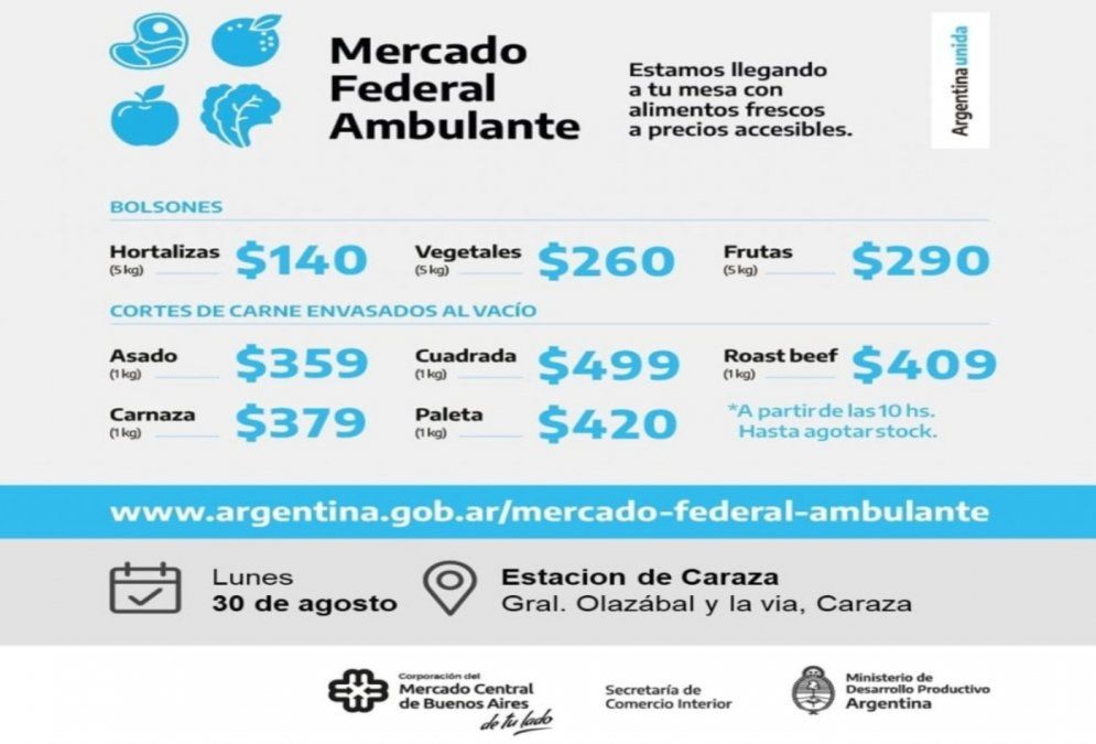 El Mercado Federal Ambulante estará hoy en la vieja estación de Villa Caraza, Lanús Oeste. Los stands abrirán a las 10 hs. y se quedarán hasta agotar stock. Allí los vecinos podrán conseguir frutas, verduras y carne a un precio mucho menor al que se maneja en negocios.