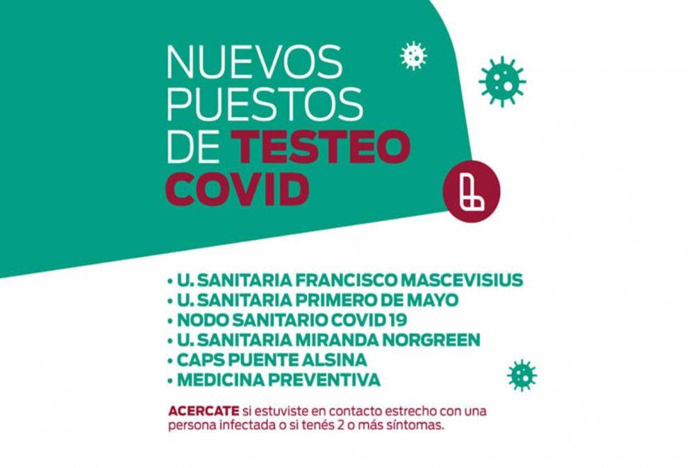 El resto de los puestos son las Unidades Sanitarias Francisco Mascevisius, Primero de Mayo y Miranda Norgeen, el Centro de Salud Puente Alsina y Medicina Preventiva. En algunos de ellos, el Municipio ofrece evaluar y de ser necesario, se realizará el testeo correspondiente con el sistema PCR para confirmar si hay o no contagio de coronavirus.
