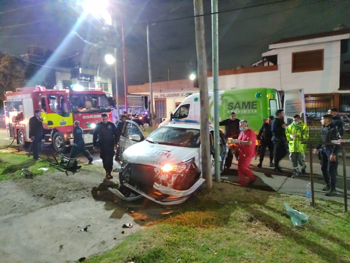 Debido al fuerte choque, el patrullero de la Policía Bonaerense salió disparado unos 3 metros hasta clavarse en un poste de luz, mientras que el vehículo de la local de Lanús culminó volcado en la esquina.