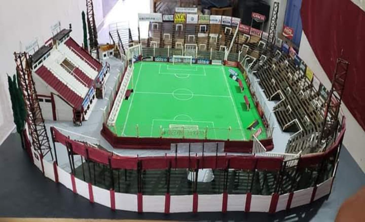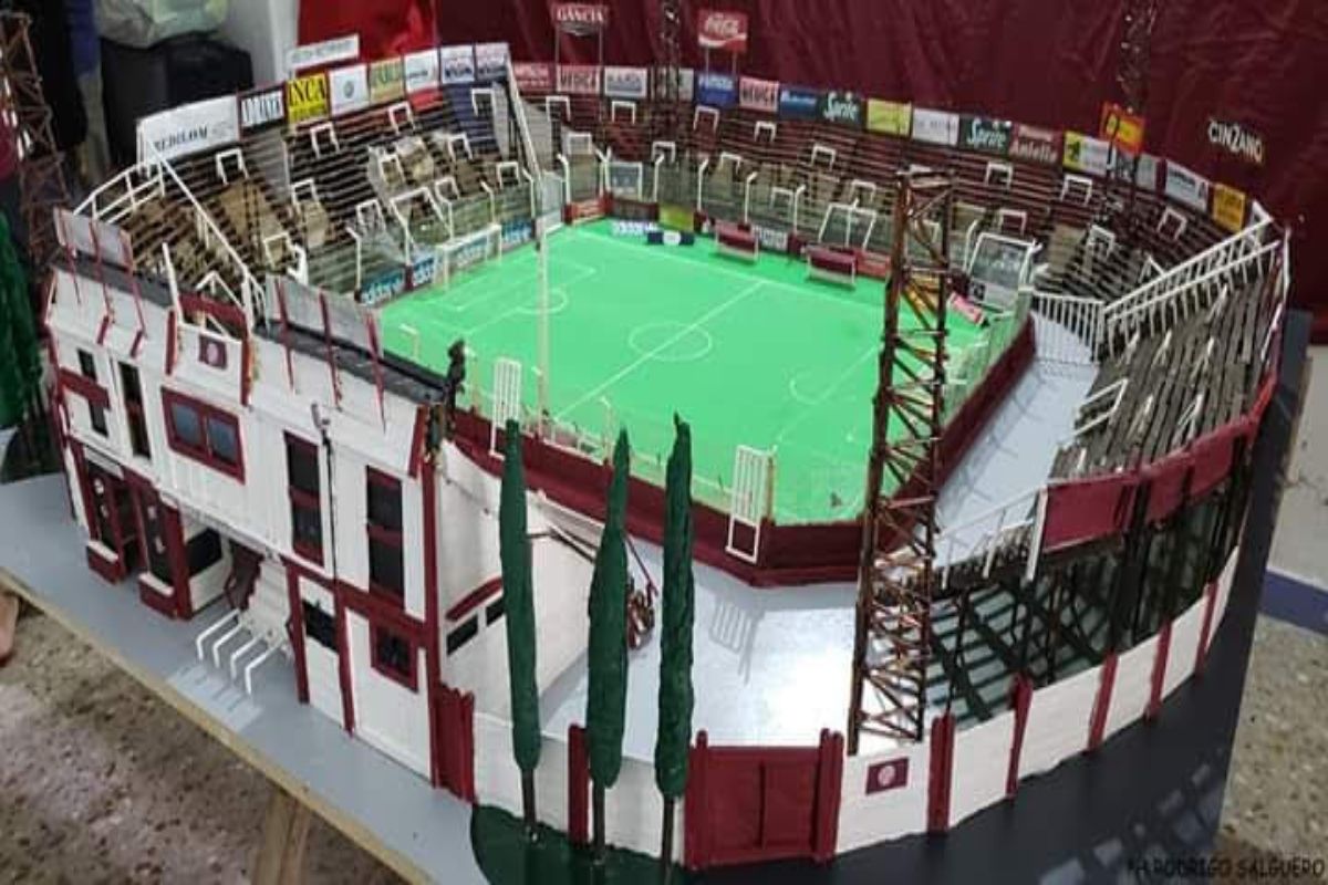 La maqueta del estadio viejo de madera es más grande en dimensiones. También está hecha de lata de cerveza y tiene las publicidades de los comercios de la zona, algunos ya no existen.