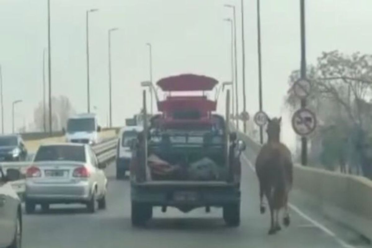 El hecho sucedió días atrás, en un puente que cruza por arriba de la avenida Hipólito Yrigoyen en Lanús Oeste. A plena hora pico de la tarde, un hombre ató a un caballo a su camioneta donde transportaba cosas en la parte trasera y lo obligó a galopar entre la gran cantidad de autos que subían el puente.