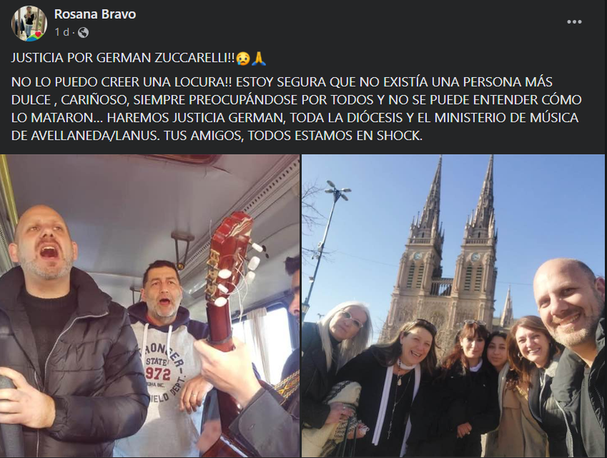 Era un hombre de vastos amigos, como Rosana, quién publicó en su perfil de Facebook un emotivo mensaje: "Justicia por Germán Zuccarelli. No lo puedo creer, una locura. Estoy seguro de que no existía una persona más dulce, cariñosa, siempre preocupándose por todos y no se puede entender como lo mataron... Haremos justicia Germán. Toda la diócesis y el Ministerio de Música de Avellaneda/Lanús, tus amigos, todos estamos en shock".