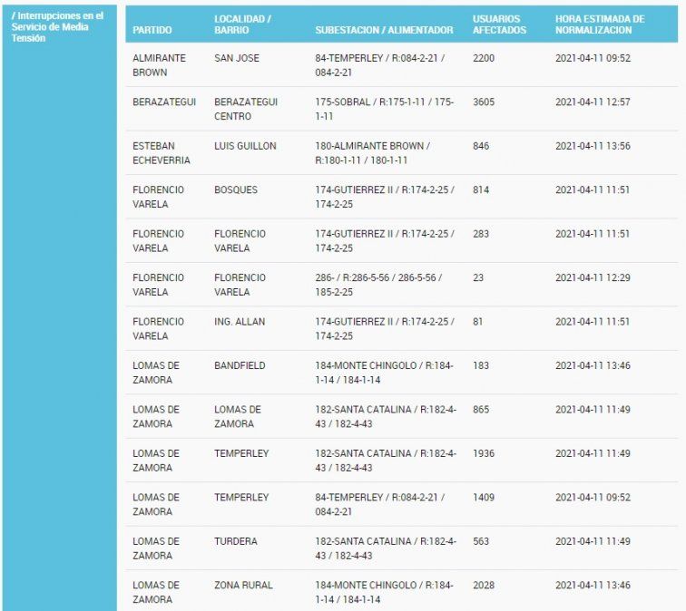 Según detalla la información del Ente Nacional Regulador de la Electricidad (ENRE), el distrito más afectado es Lomas de Zamora con más de 7.000 casas sin energía, pero hay vecinos sin suministro en varios municipios por "Interrupciones en el Servicio de Media Tensión".