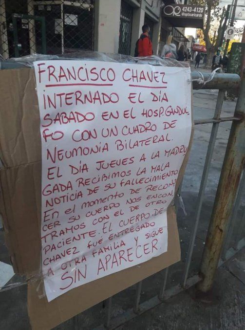 Por su parte, Francisco Chávez había ingresado por una insuficiencia respiratoria y también falleció a los pocos días. A sus hijos sí los dejaron reconocer el cuerpo porque él no tenía Covid-19. Pero al entrar a la morgue, de manera alarmante se encontraron con que ese cuerpo no era su padre, sino que se trataba de Romualdo Pérez. En ese momento comenzaron las denuncias, reclamos y fuertes protestas de la familia Chávez para saber dónde estaba el cadáver de Francisco.