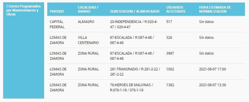 De la misma forma explicaron desde el organismo nacional que este apagón se debe a "Cortes Programados por Mantenimiento y Obras" y también aseguraron que el horario estimado de normalización sería pasadas las 13:30 para uno de los alimentadores y otros no tienen datos.