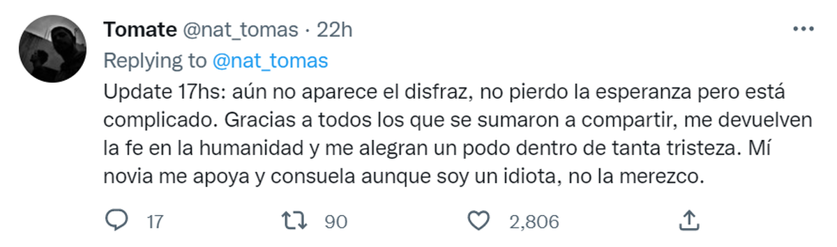 "Aún no aparece el disfraz, no pierdo la esperanza pero está complicado", señaló el usuario horas después del primer posteo, y agradeció a todas las personas que se sumaron a difundir su búsqueda: "Me devuelven la fe en la humanidad y me alegran un podo dentro de tanta tristeza. Mí novia me apoya y consuela aunque soy un idiota, no la merezco".