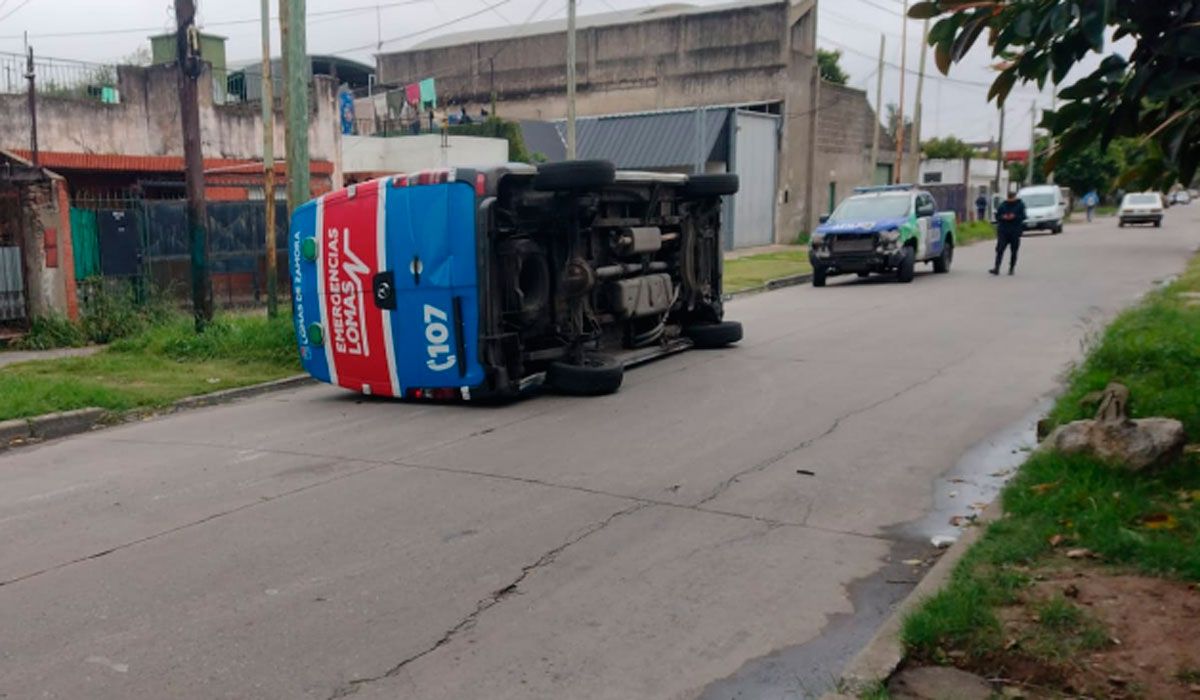 Una ambulancia del Municipio de Lomas de Zamora volcó tras chocar con un auto en la localidad de Villa Fiorito. Bomberos y Defensa Civil trabajaron en el lugar.