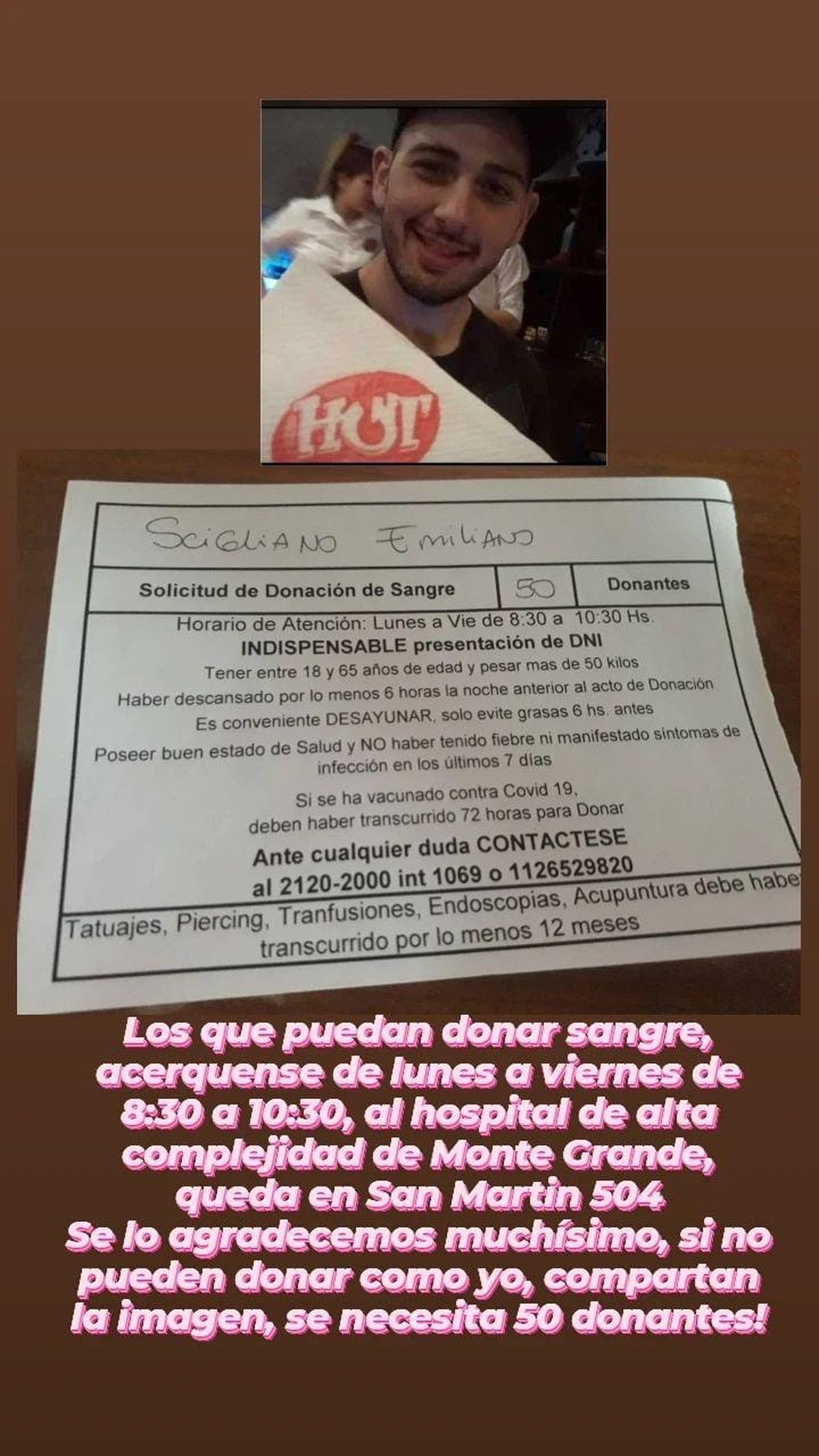 Por esta razón fue trasladado al Hospital de Alta Complejidad del Bicentenario de Monte Grande donde permanece con estado reservado, mientras espera por la llegada de donantes de sangre para las rigurosas intervenciones que debe realizarse. Frente a la desesperación por la situación de Emiliano, su familia y amigos realizaron una publicación para encontrar con urgencia a los 50 voluntarios necesarios.