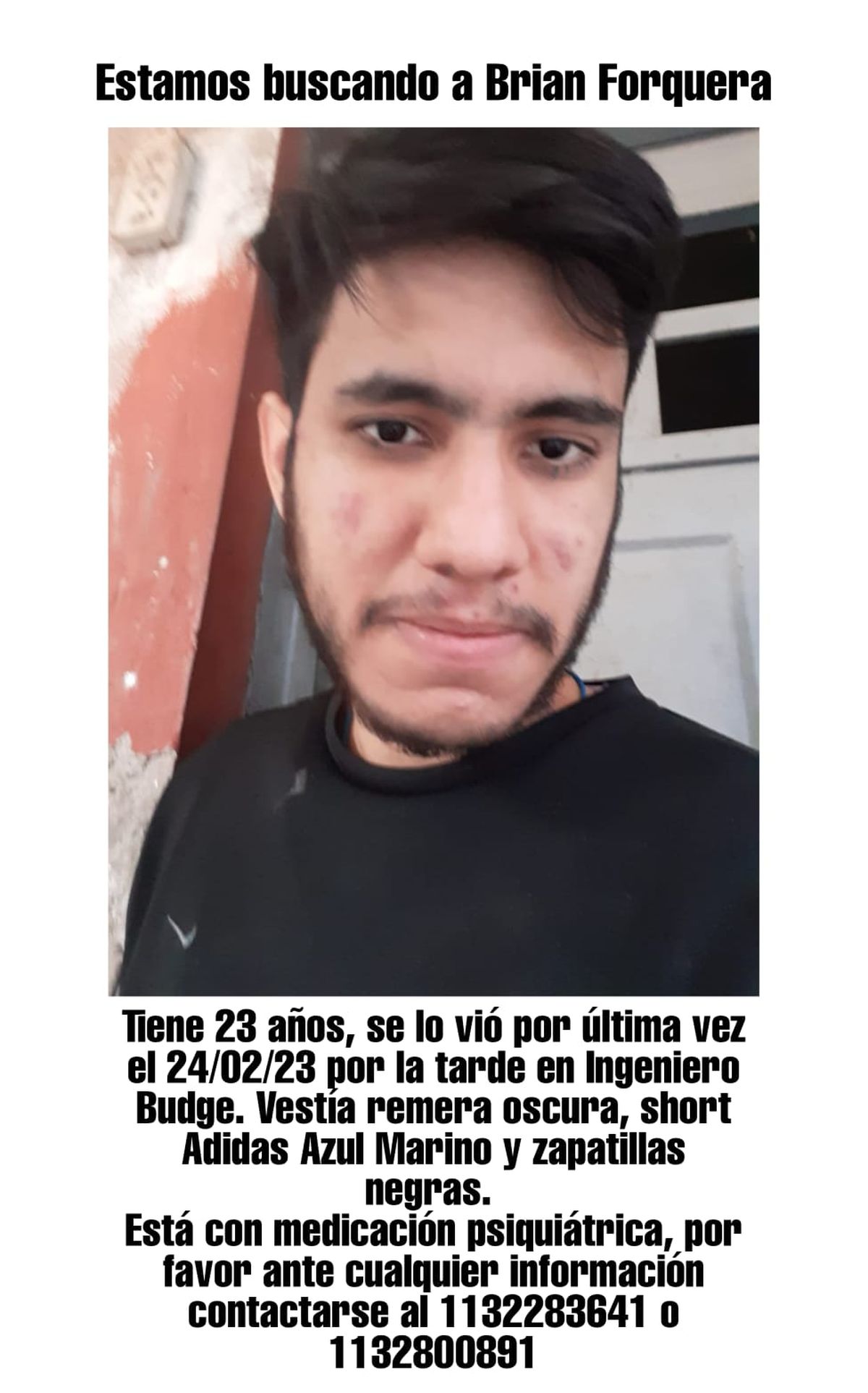 Brian Matías Forquera tiene 23 años es paciente psiquiátrico y se encuentra perdido desde el pasado viernes 24 de febrero cuando se marchó de su casa en la localidad de Ingeniero Budge, en Lomas de Zamora, y hasta el momento no regresó. Familiares, amigos, vecinos y la Policía lo buscan intensamente.