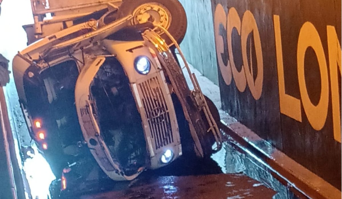 Por ello, el camión chocó contra el techo del túnel y volcó en medio del paso, interrumpiendo el tránsito en plena hora pico. Aunque afortunadamente no se registraron heridos de gravedad, resulta muy problemático sacar el camión de adentro del paso bajo nivel.