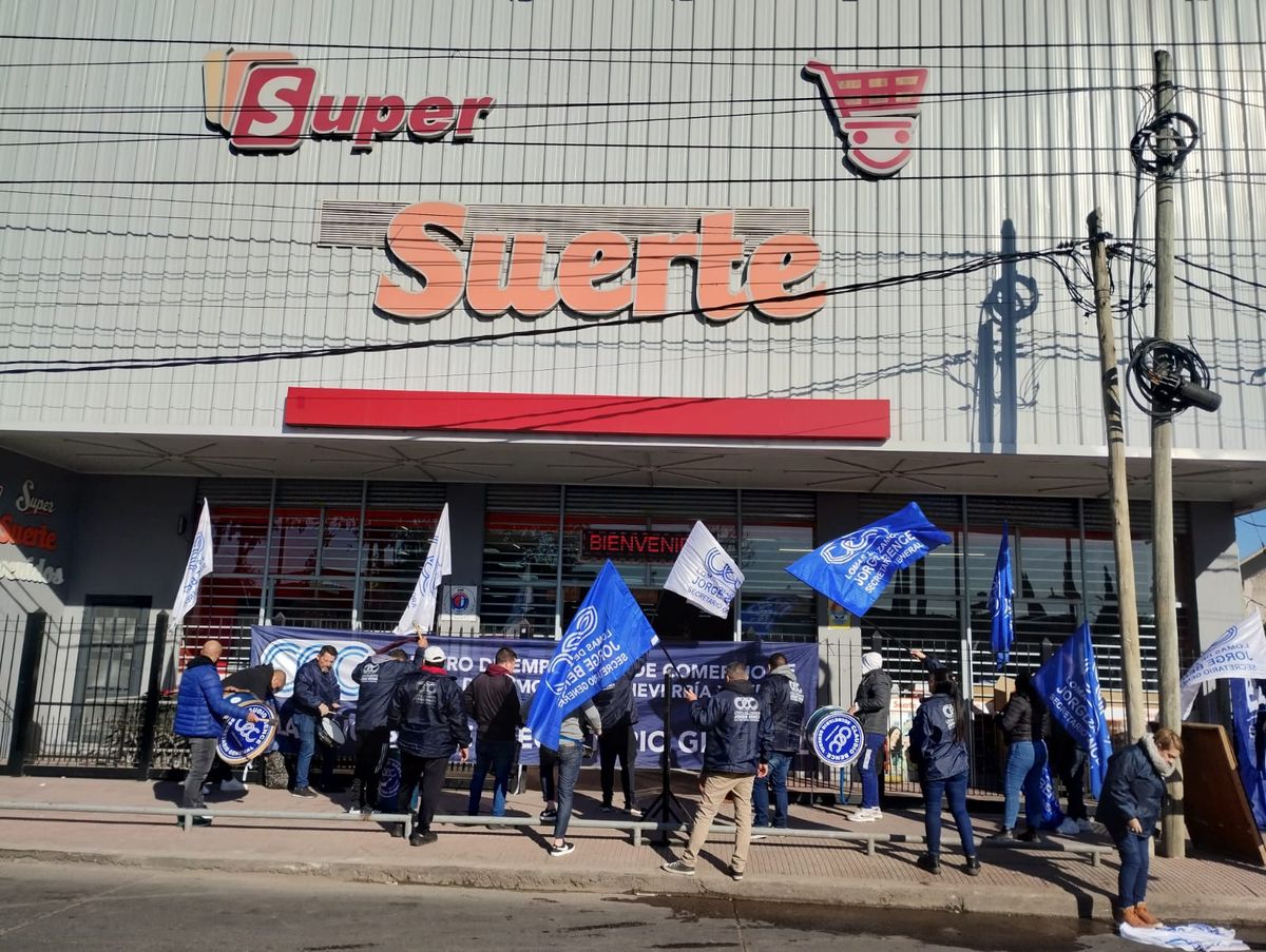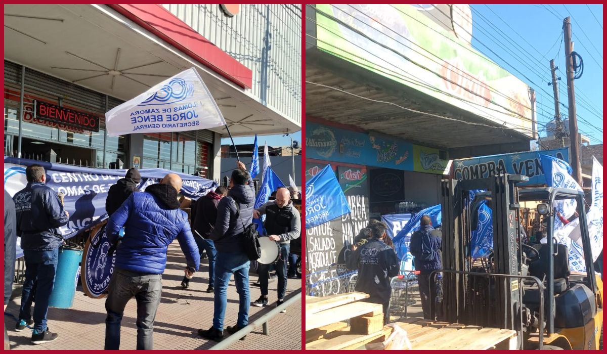 Trabajadores y miembros del Sindicato de Empleados de Comercio (CEC) de Lomas protestan frente a un supermercado y un mayorista de manera simultánea.