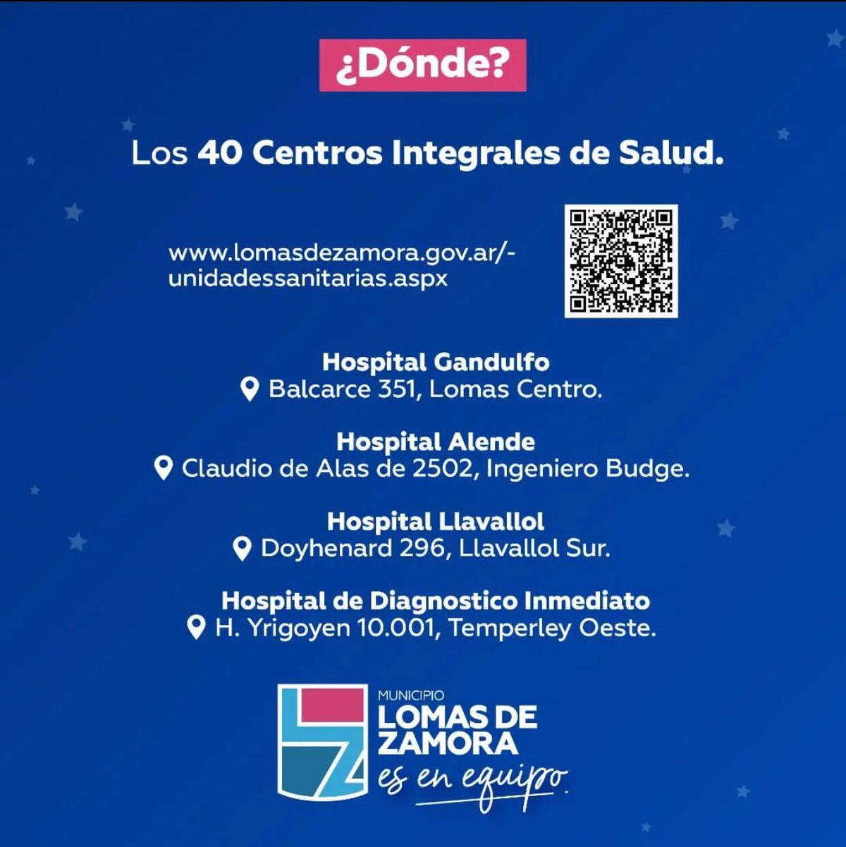 Además de los 40 Centros Integrales de Salud del distrito, los establecimientos que también abrirán sus puertas de 17 a 20 horas este miércoles serán el Hospital Gandulfo, con dirección en Balcarce 351, el Hospital Alende de Fiorito, ubicado en Claudio de Alas y Azamor, el Hospital Llavallol en Dyohenard 296 y el Hospital de Diagnóstico Inmediato de Temperley en Hipólito Yrigoyen y Brandsen.