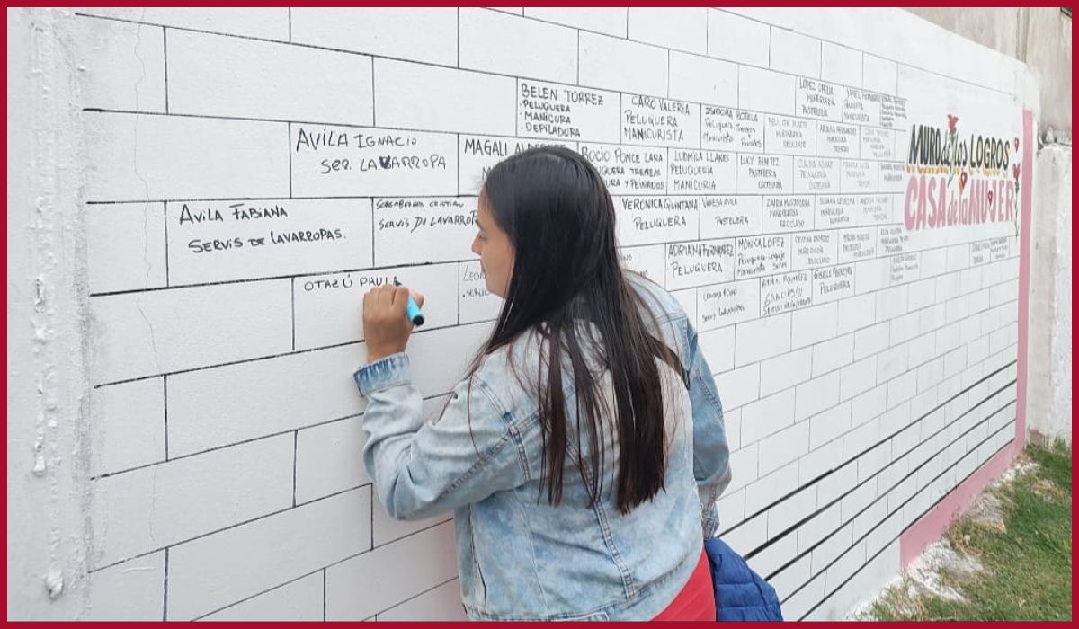 En una pared de este espacio que tiene como objetivo de descubrir y potenciar las habilidades de las lomenses que deseen aprender un oficio generándose una fuente de trabajo, dibujaron ladrillos y en cada uno de estos, que funcionan como casilleros, las chicas comenzaron a plasmar su nombre y el emprendimiento con el cual alcanzaron sus logros.