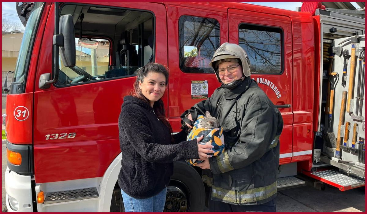 Pese al gran susto y afortunadamente el gato resultó ileso y fue entregado a su tutora que momentos más tarde decidió tomarse una foto con los bomberos como agradecimiento por el rescate de su mascota.