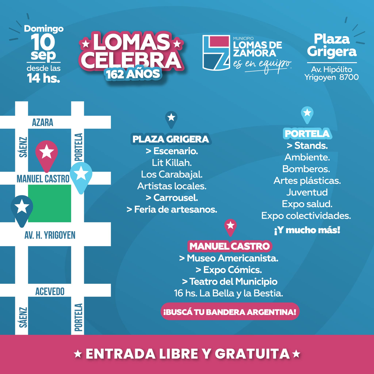 En el marco del 162° aniversario de la ciudad, el Municipio de Lomas de Zamora anunció que se realizará un show gratuito que se llevará adelante el próximo domingo 10 de septiembre a partir de las 14 horas.