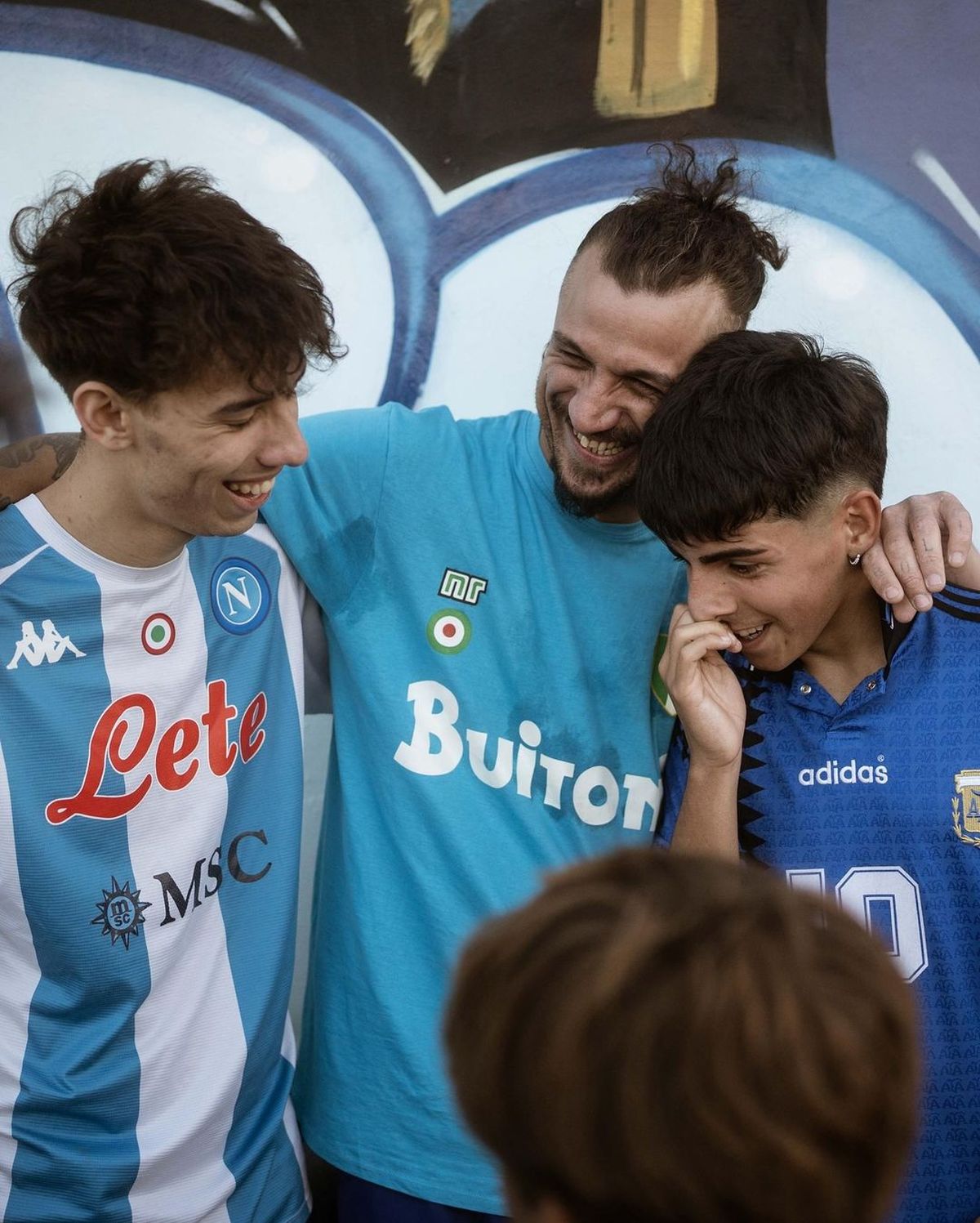 El jugador se mostró con un conjunto especial para el evento en la cuna de Diego Maradona, ya que tenía una camiseta como la que usaba el Diez en el Nápoli de Italia y un short de Boca, el equipo de los amores de Diego. Benjamín y Gianluca también usaron camisetas con el diez en la espalda y el nombre Maradona.