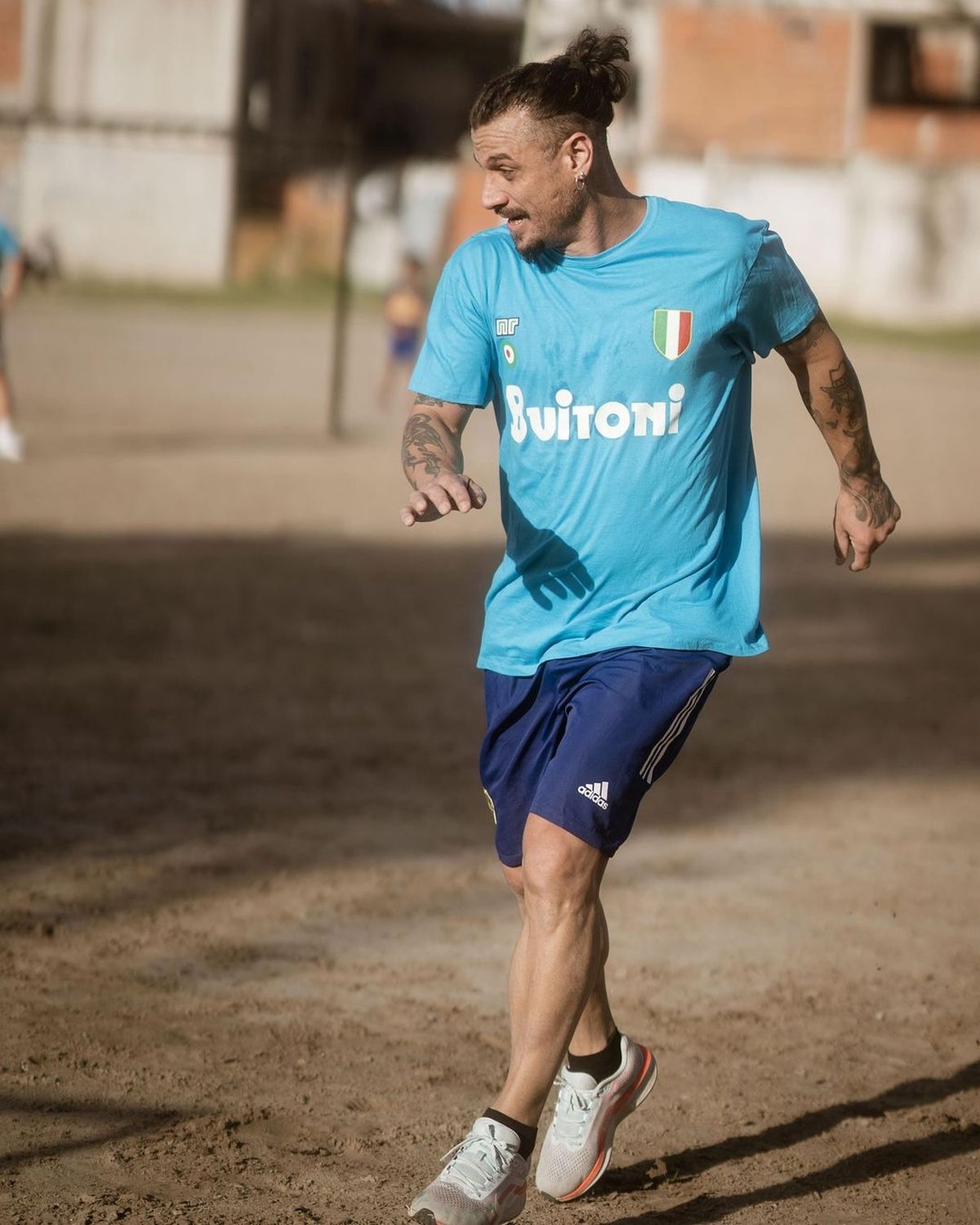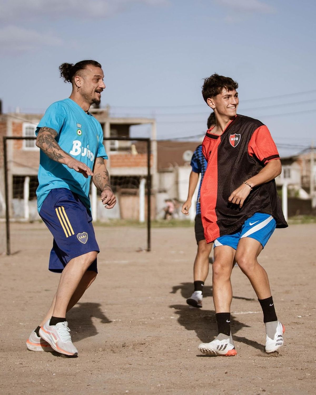 El ex futbolista Daniel Osvaldo llegó a Fiorito junto a Benjamín Agüero, el hijo de Giannina Maradona y el Kun Agüero, para disputar un partido de fútbol en el Potrero de Dios, lugar de Villa Fiorito donde Diego Maradona dio sus primeros pasos en el deporte.