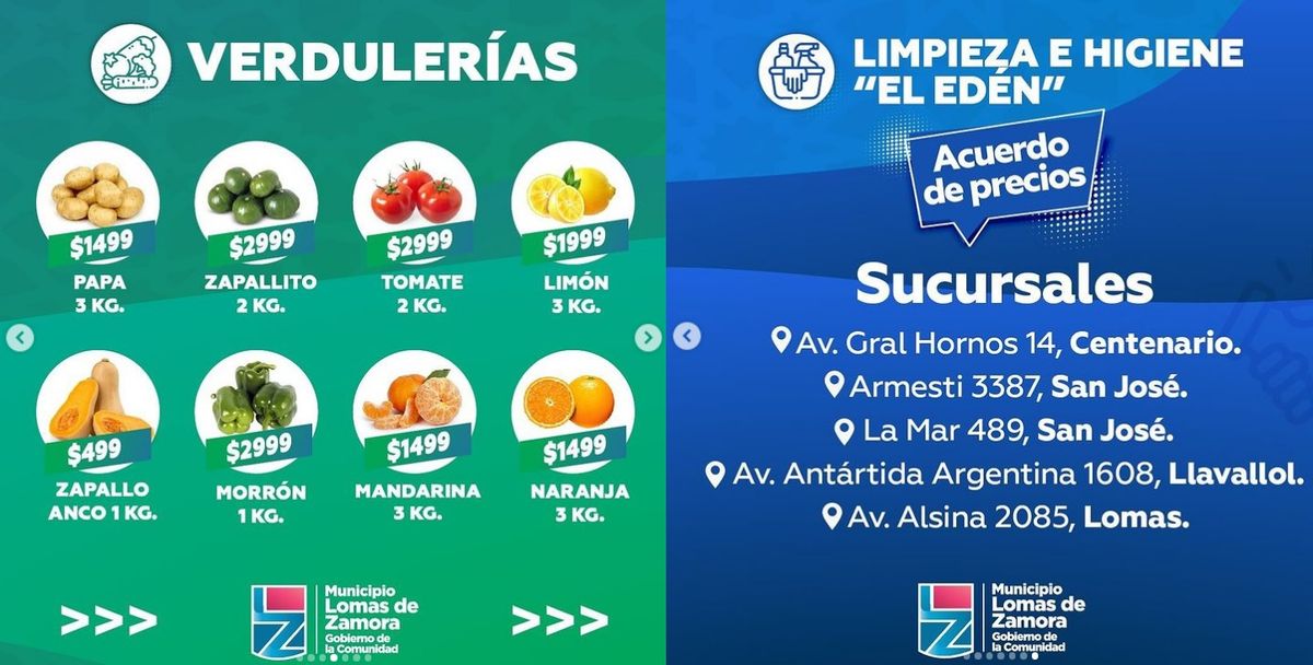 Además se fijaron precios con verdulerías ubicadas en Temperley, Llavallol y Lomas. Algunos precios acordados son: tres kilos de papa a $1499 y los dos de zapallito a $2999 al igual que los dos de tomate. El kilo de zapallo anco al precio de $499, el de morrón a $2999 y los tres de limón a $1999. La mandarina y la naranja, ambas en una promoción por tres kilos a $1499.