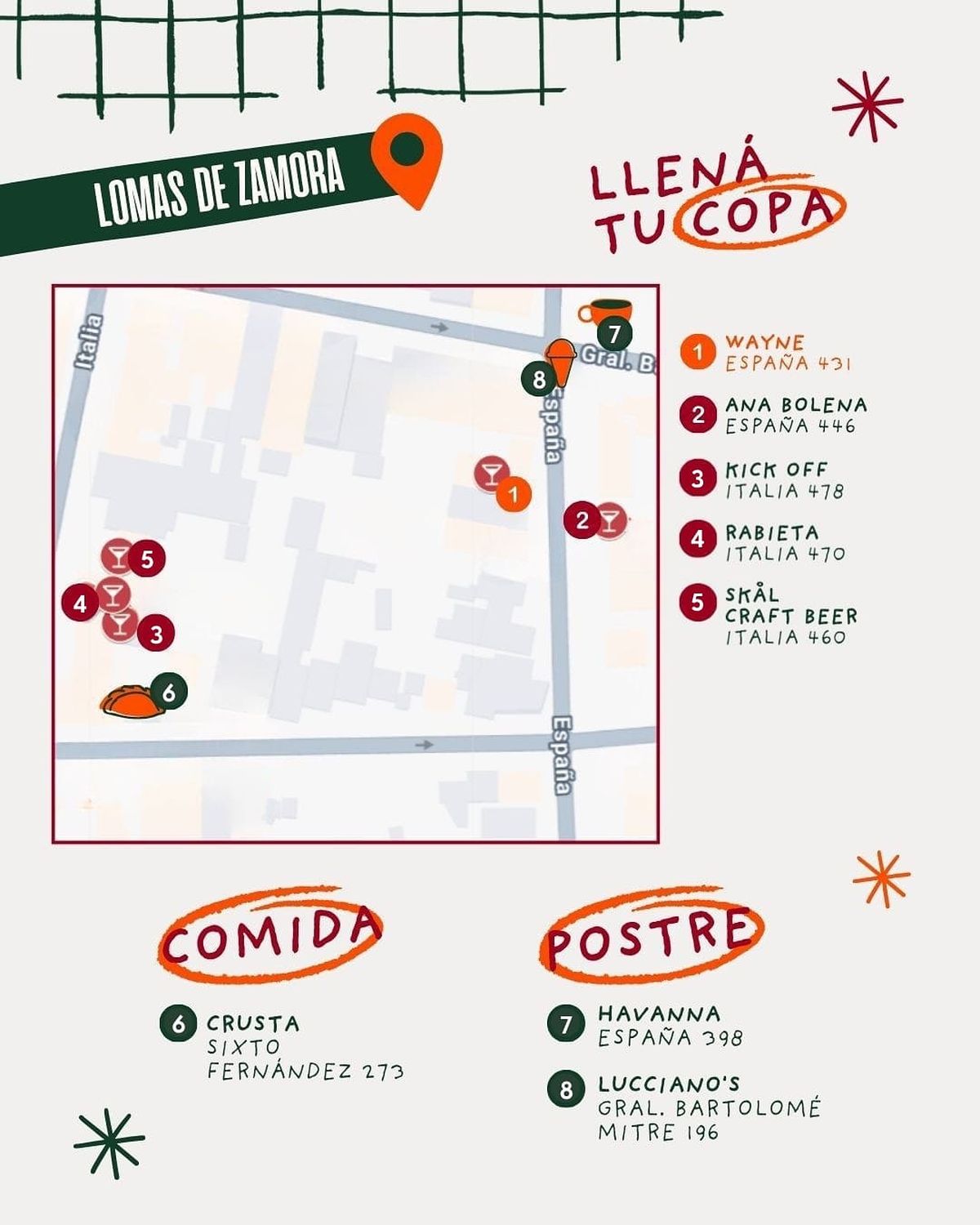 En Lomas, los vecinos podrán comprar una copa de vino por $5.000 en Wayne (España 431) y recargarla por $4.000 en otros bares que forman parte del circuito. Entre los locales adheridos se encuentran Ana Bolena (España 446), Chingon (Sixto Fernández 254), Kick Off (Italia 478), Rabieta (Italia 470) y Skal (Italia 460).