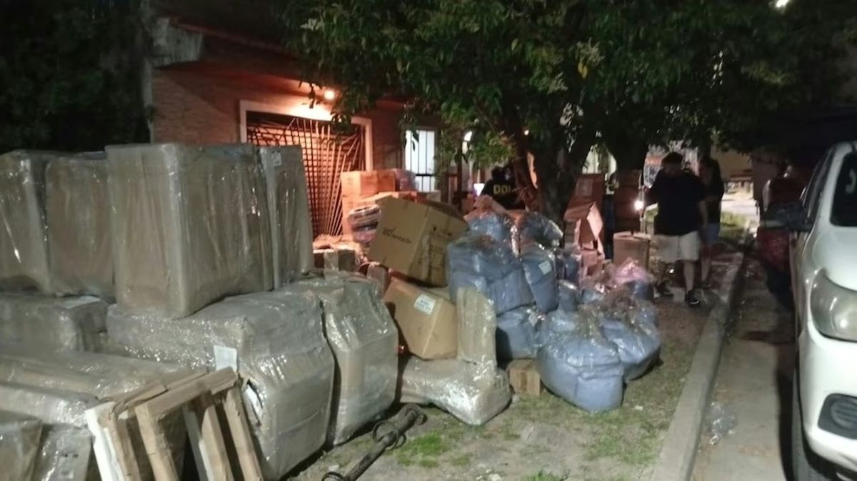 En los allanamientos se incautaron siete pallets completos con un total de 554 bolsas de materiales, además de decenas de bultos y cajas. La mercadería recuperada incluye elementos de construcción, equipamiento gastronómico, mobiliario, iluminación, productos médicos y alimentos, entre otros rubros.