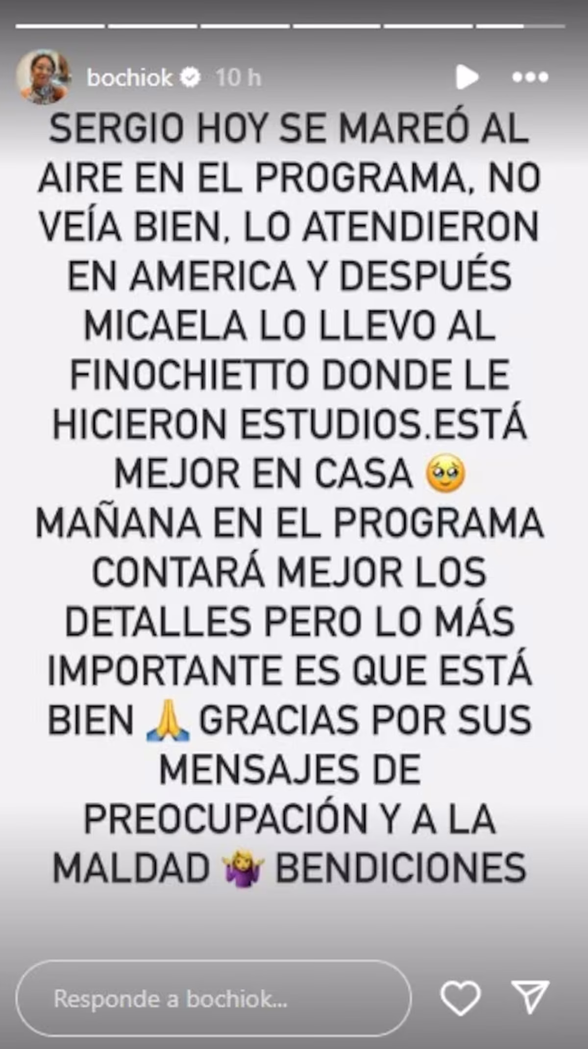 Quien hizo referencia de forma directa al rumor sobre el estado de salud de Lapegüe fue su mujer, Silvia Lapegüe. La Bochi, como la conocen, le contestó ayer a los críticos de manera tajante desde sus historias de Instagram: compartió la captura de pantalla de quien aseguró que su marido había muerto y pidió denunciarlo. Luego hizo referencia a la salud del conductor. “Sergio hoy se mareó al aire en el programa, no veía bien, lo atendieron en América y después Micaela -la hija- lo llevó al Finochietto, donde le hicieron estudios”, arrancó una segunda historia. “Está mejor en casa. Mañana en el programa [por hoy] contará mejor los detalles, pero lo más importante es que está bien. Gracias por sus mensajes de preocupación”, completó.