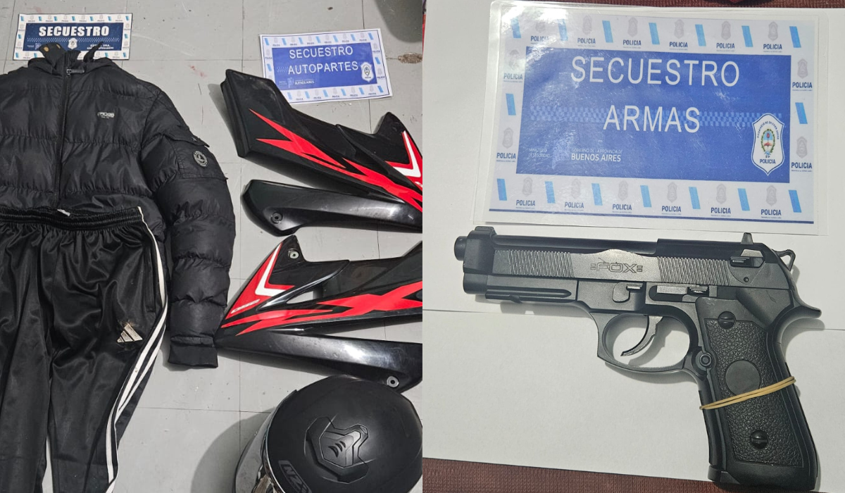 Durante el operativo, la Policía secuestró una réplica de pistola de aire comprimido, prendas de vestir y un casco que habrían sido utilizados en el hecho investigado.