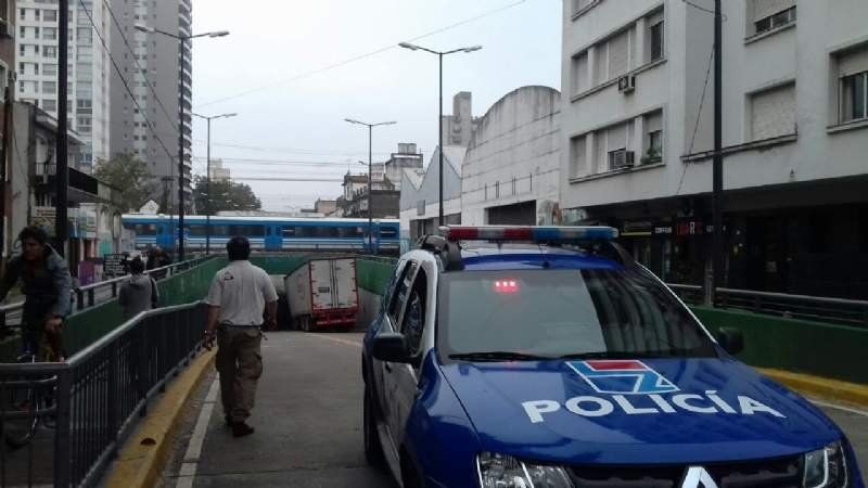 El paso bajo nivel de la calle Larroque hacia Alsina, se encuentra cerrado debido a que un camión que no tuvo en cuenta el límite de altura quedó clavado en el puente. La rueda del lado derecho del vehículo no tiene tracción por lo que no pueden sacarlo.