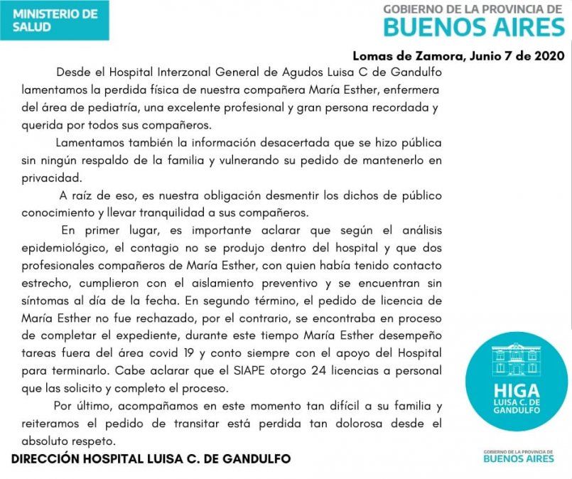 “Lamentamos la pérdida física de nuestra compañera María Esther, enfermera del área de Pediatría, una excelente profesional y gran persona recordada y querida por todos sus compañeros. Lamentamos también la información desacertada que se hizo pública sin ningún respaldo de la familia y vulnerando su pedido de mantenerlo en privacidad”, comenzó el comunicado oficial del centro médico de Lomas de Zamora.