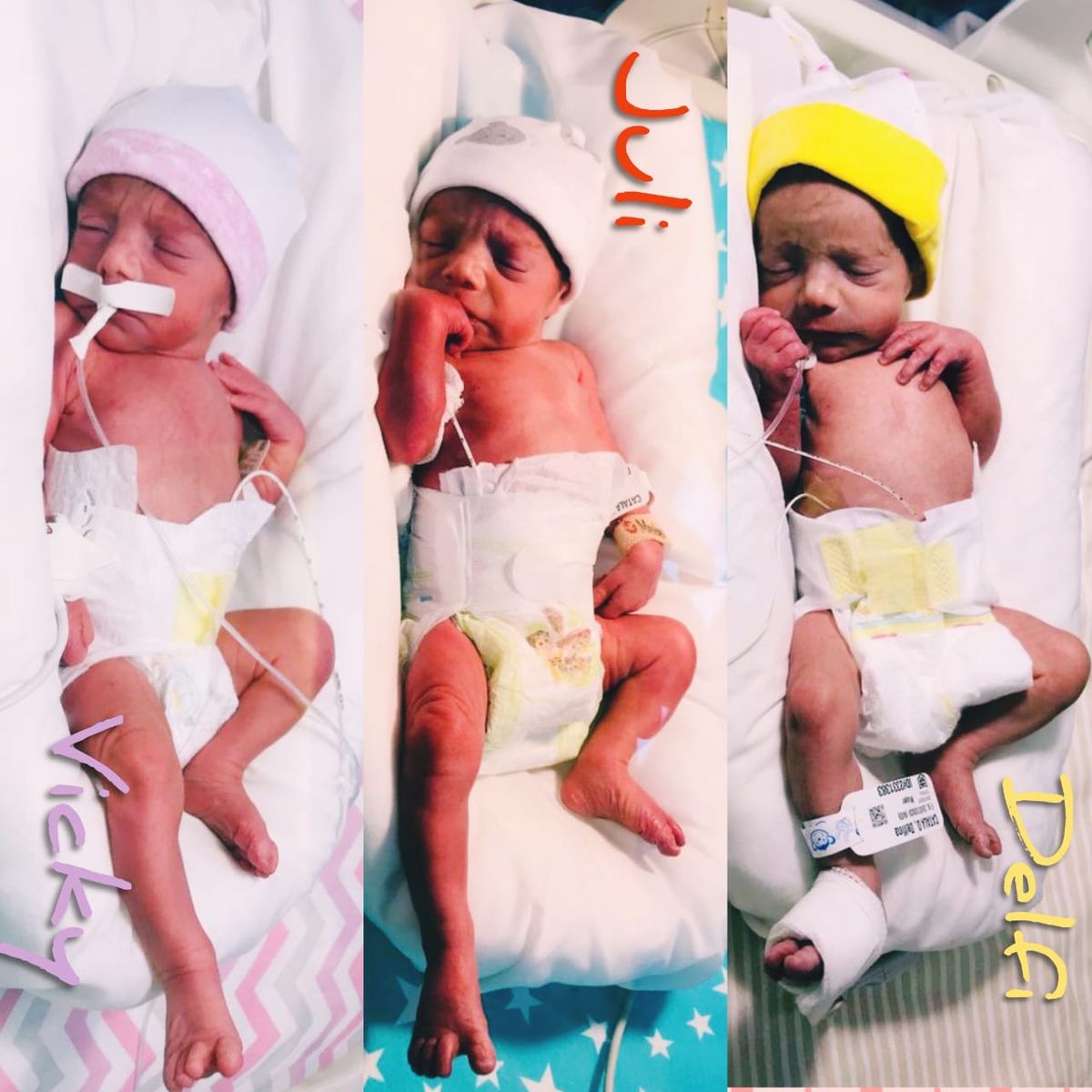 Victoria, Julieta y Delfina, las trigemelas de Lomas de Zamora, pocos instantes después de su nacimiento.