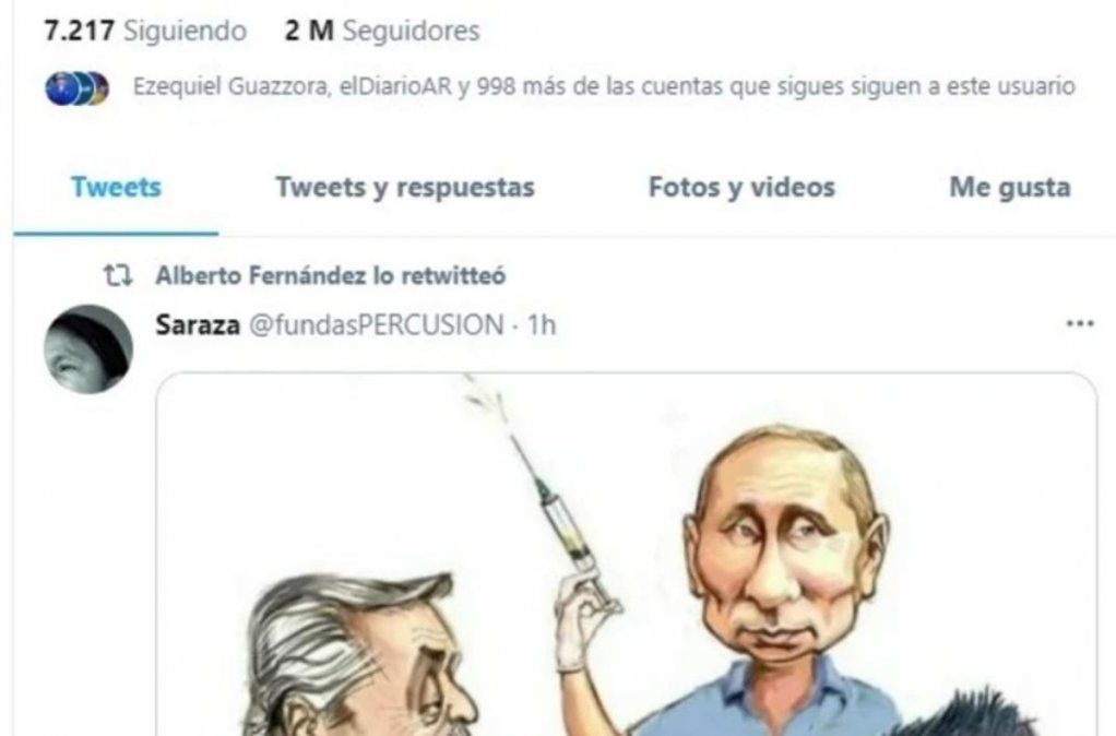 El presidente Alberto Fernández replicó en su cuenta de Twitter una ilustración en la que se lo ve junto a Putin vacunando a un gorila y desató la polémica