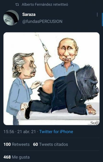 El presidente de la Nación, Alberto Fernández, se vio envuelto en una polémica luego de compartir en Twitter una caricatura en la que se lo ve junto al mandatario ruso Vladimir Putin a punto de vacunar a un gorila, en alusión a los sectores opositores que desde el peronismo identifican con ese animal. El jefe de Estado de Rusia sostiene una jeringa y el argentino le cola un algodón en la cola al próximo inoculado.