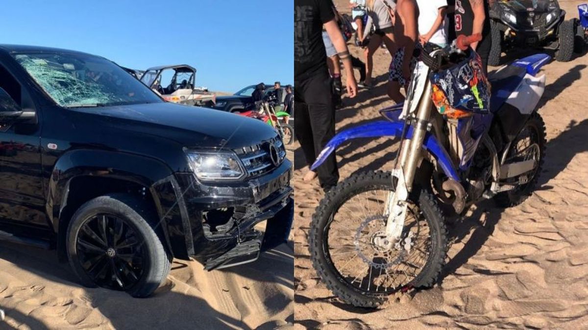 En el impactante video se ve cómo una camioneta que corría una picada en la playa impacta de lleno con la moto.