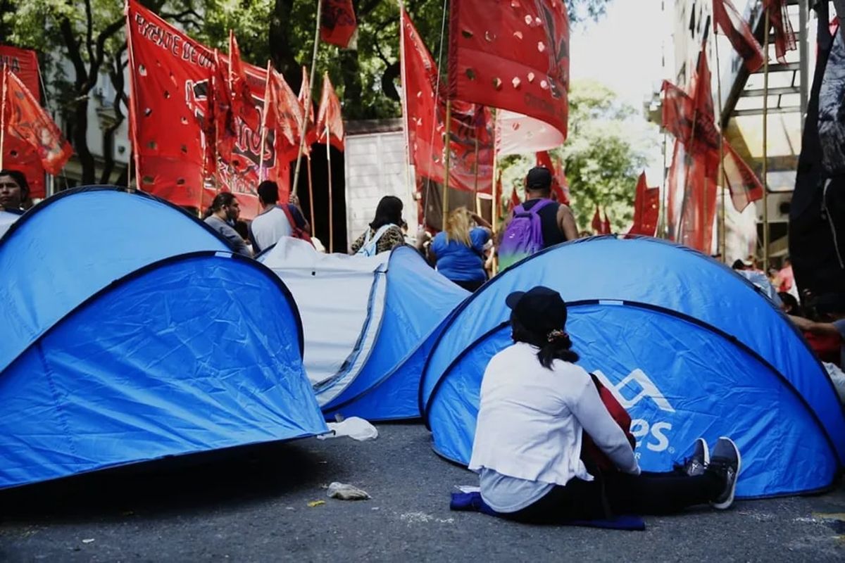 La protesta se inició a las 15 en las inmediaciones del cruce de las avenidas 9 de Julio y Belgrano, pero tuvo también capítulos en varias provincias del país. Se trata de una jornada denominada Acampe Piquetero Nacional, una protesta que durará dos días y cuyo fin es rechazar por “insuficiente” el aumento anual de 40 por ciento que el Gobierno, los empresarios y las dos centrales obreras prevén fijar mañana para el salario mínimo, vital y móvil, que actualmente es de $33.000.