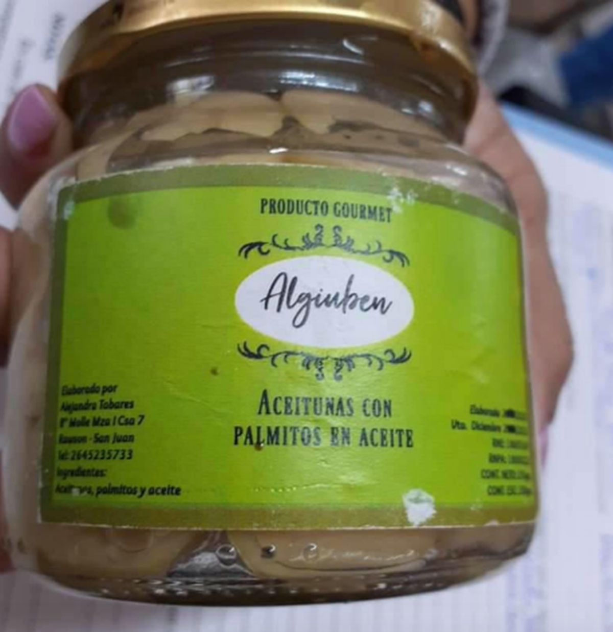 En el mismo, se comunicó la prohibición de la "elaboración, fraccionamiento y comercialización en todo el territorio nacional de los productos rotulados como marca “Algiuben - Producto Gourmet”: “Aceitunas con palmitos en aceite”- RNPA: 18000222; “Aceitunas negras condimentadas en aceite- RNPA: 18000229; “Aceitunas con almendras en aceite”, - RNPA: 18000220 y “Aceitunas con nueces en aceite”, - RNPA: 18000232; todos RNE N° 18005569, Elaborados por Alejandra Tobares, B° Molle Mza/ Csa 7, Rawson-San Juan, por carecer de registros sanitarios, estar falsamente rotulados al consignar rótulos inexistentes, resultando ser productos ilegales".