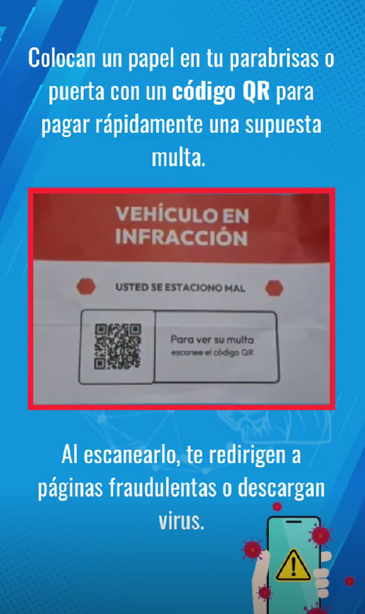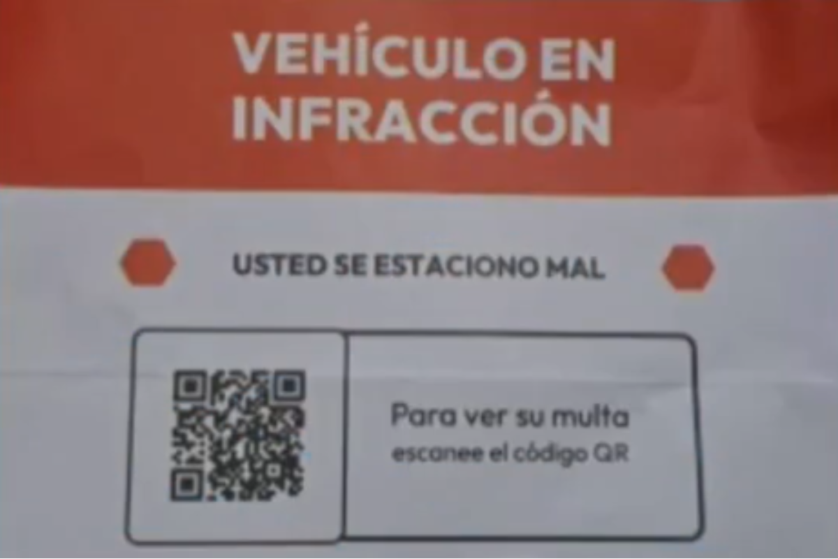En este caso, atraen a las víctimas mediante un cartel rojo y blanco que advierte al usuario sobre una falsa infracción de tránsito por haber estacionado mal su rodado. De esta manera, instan a la persona a escanear el código QR para verificar cuál es la multa que habría cometido, aunque en realidad sea falsa.
