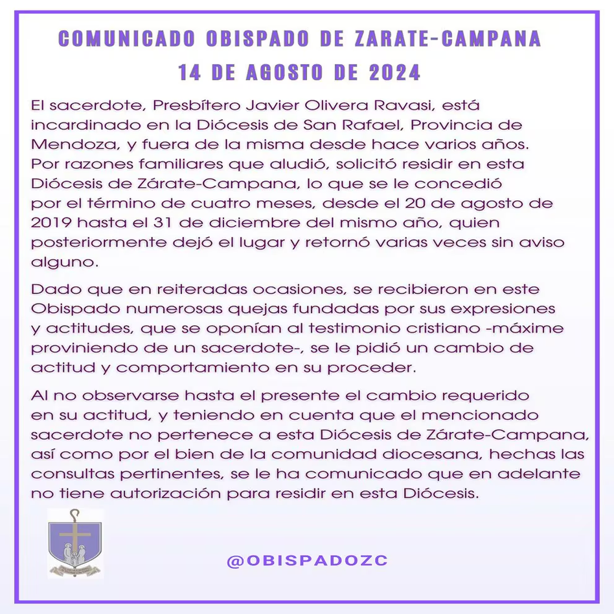 El texto del Obispado continúa: “El sacerdote, presbítero Javier Olivera Ravasi, está incardinado en la Diócesis de San Rafael, Provincia de Mendoza, y fuera de la misma desde hace varios años. Por razones familiares que aludió, solicitó residir en esta Diócesis de Zárate -Campana, lo que se le concedió por el término de cuatro meses, desde el 20 de agosto de 2019 hasta el 31 de diciembre del mismo año, quien posteriormente dejó el lugar y retornó varias veces sin aviso alguno”.