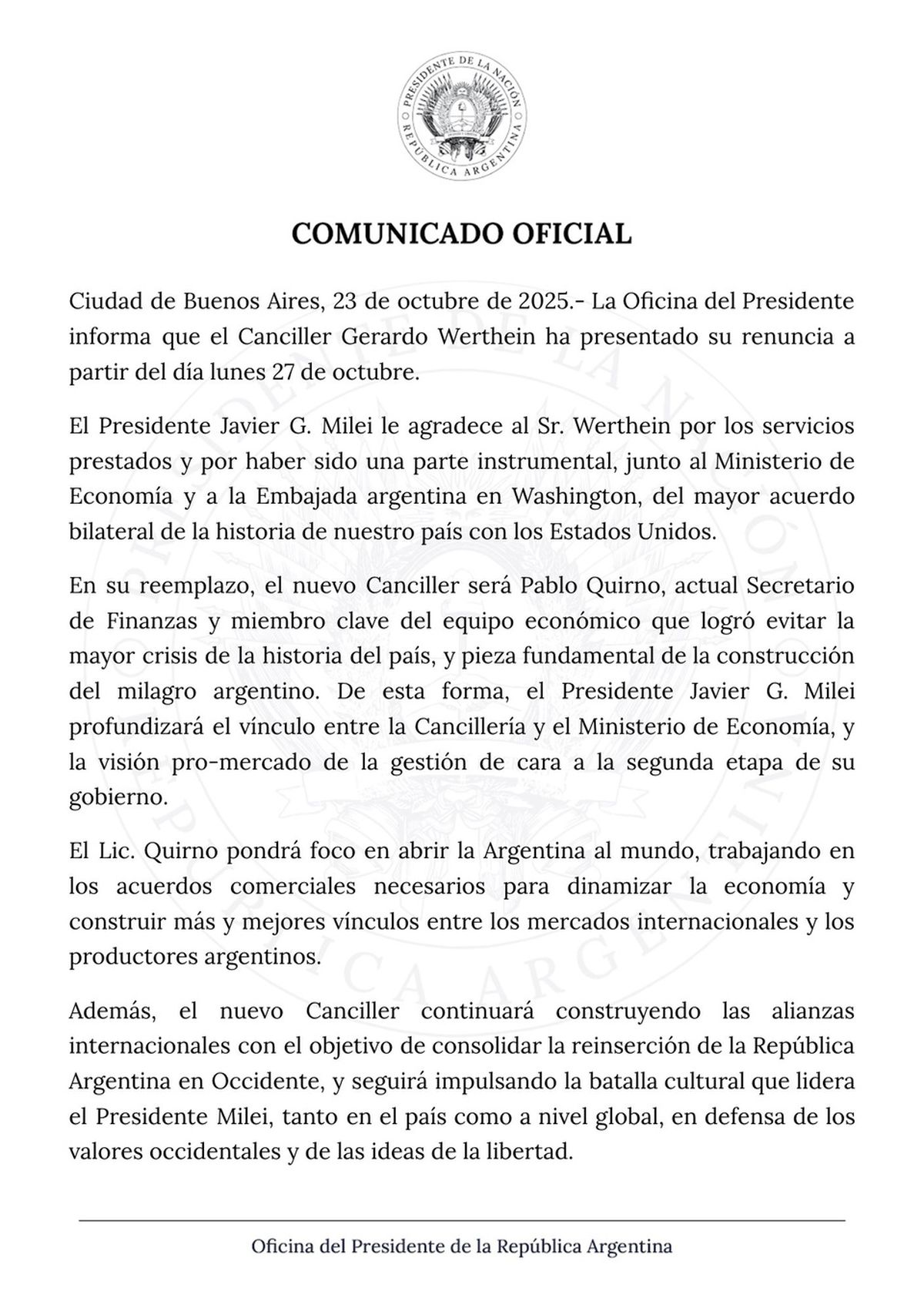 “La Oficina del Presidente informa que Gerardo Werthein ha presentado su renuncia a partir del lunes 27 de octubre. En su reemplazo, el nuevo canciller será Pablo Quirno, actual secretario de Finanzas y miembro clave del equipo económico que logró evitar la mayor crisis de la historia del país”, indicó el comunicado oficial del Gobierno nacional.