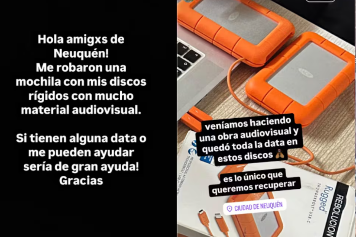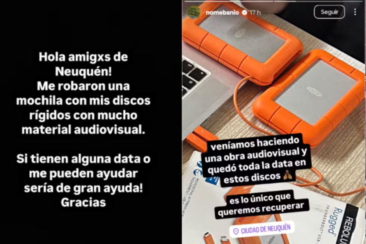 Y agregó: "Veníamos haciendo una obra audiovisual y quedó toda la data en esos discos. Es lo único que queremos recuperar". Luego, sumó otra historia con una foto de la ubicación exacta donde habría ocurrido el robo.