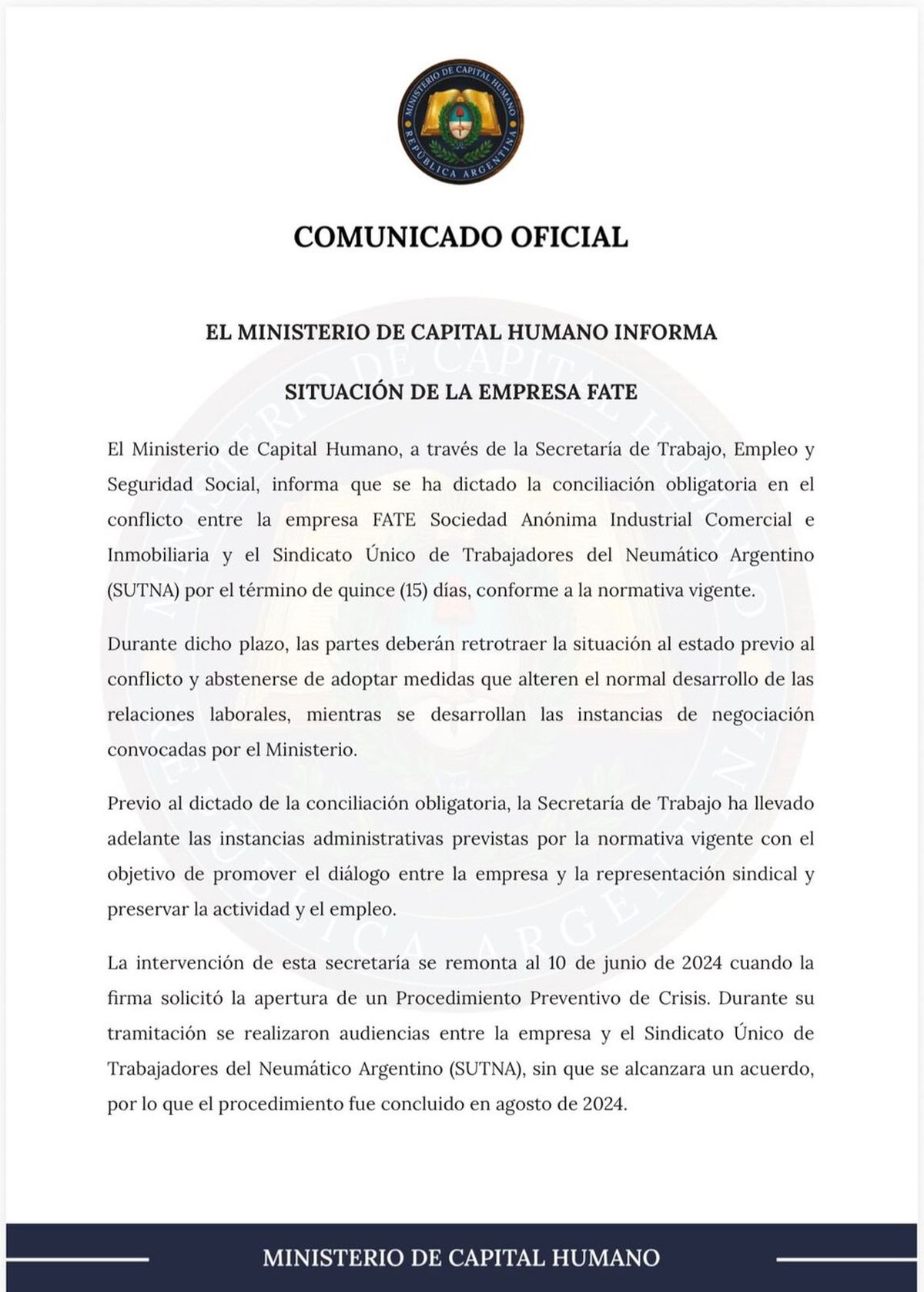 “El Ministerio de Capital Humano continuará promoviendo las instancias de mediación necesarias, en resguardo del empleo y del cumplimiento de la normativa laboral y de seguridad social vigente”, plantearon en el documento publicado en redes sociales y difundido por la cartera que lidera Sandra Pettovello.