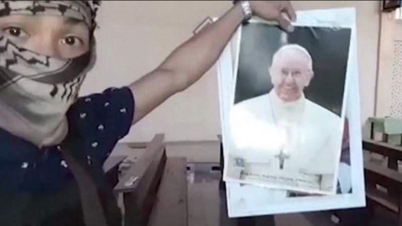 En el video se puede ver como destruyen e incendian una iglesia y amenazan bajo la imagen del santo pontífice .