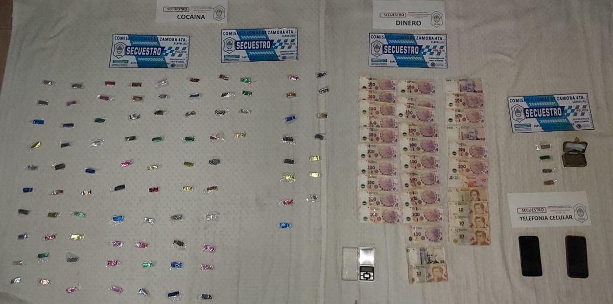 En el operativo se incautaron 93 envoltorios de papel glasé con 51,5 gramos de cocaína, un pequeño cofre de mandera con 7,5 gramos de marihuana, 2.720 pesos en billetes de diferentes denominaciones, dos celulares, una balanza de precisión y un auto Volkswagen Polo color azul.