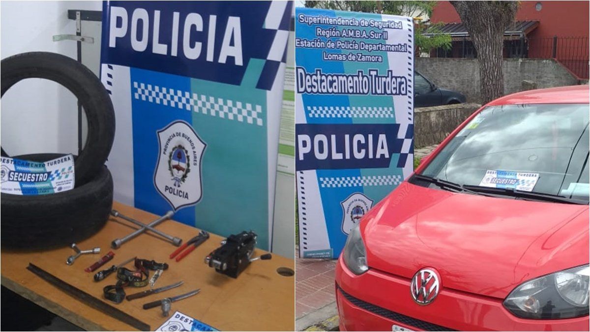 Los agentes incautaron el Volkswagen Up y varios objetos que el delincuente utilizaba para extraer las ruedas y llevar a cabo los asaltos. Más tarde, al revisar los antecedentes del detenido, constataron que el sujeto había violado el arresto domiciliario que le había concedido la Justicia de Lomas de Zamora por delitos de este tipo.