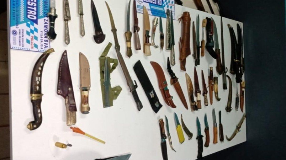 Armas blancas incautadas en el operativo por violencia de género en Villa Galicia, Lomas de Zamora.