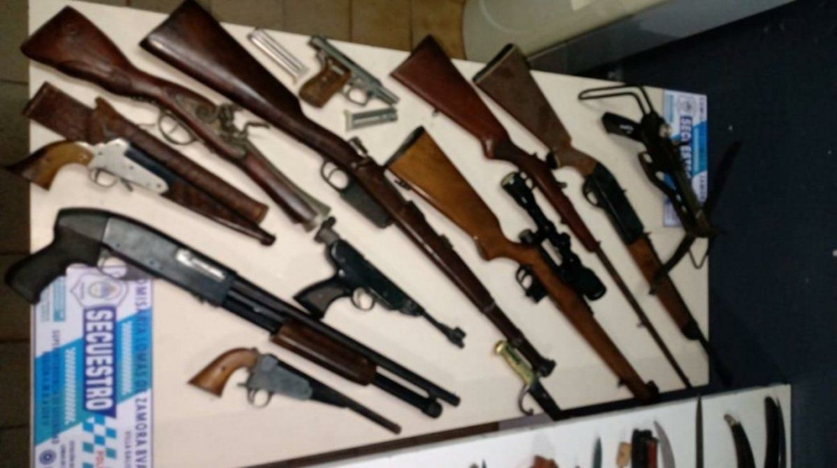 En el operativo, los oficiales incautaron pistolones, una escopeta, un fusil de caballería, carabinas, una ballesta, una pistola de aire comprimido, una bayoneta, dagas, cuchillos, una catana y municiones de distintos calibres.