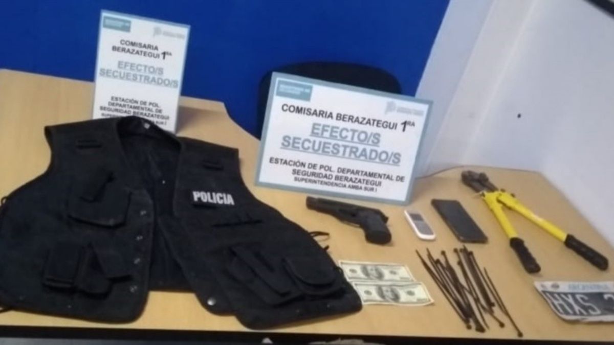 La policía pudo incautar una réplica de una pistola 9 milímetros, una pinza de corte, patentes de vehículos, teléfonos celulares, documentación, precintos plásticos, un chaleco de transporte con la inscripción Policía y una suma de dólares.