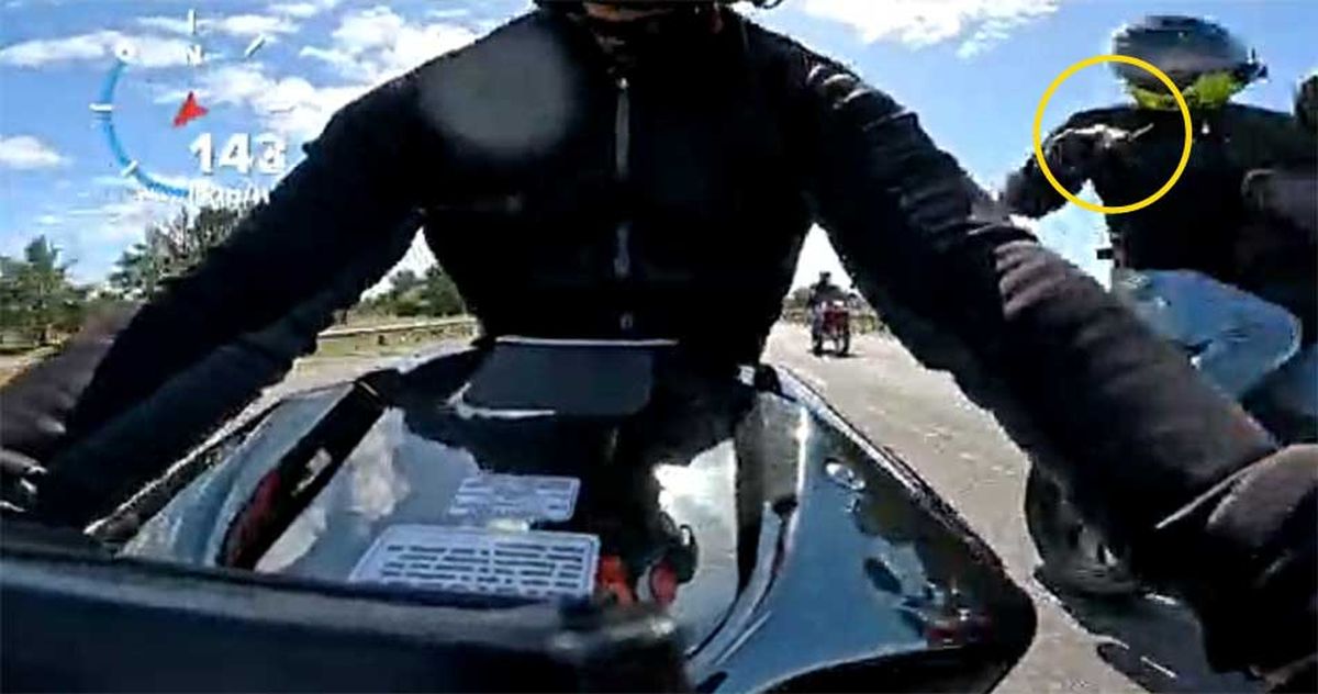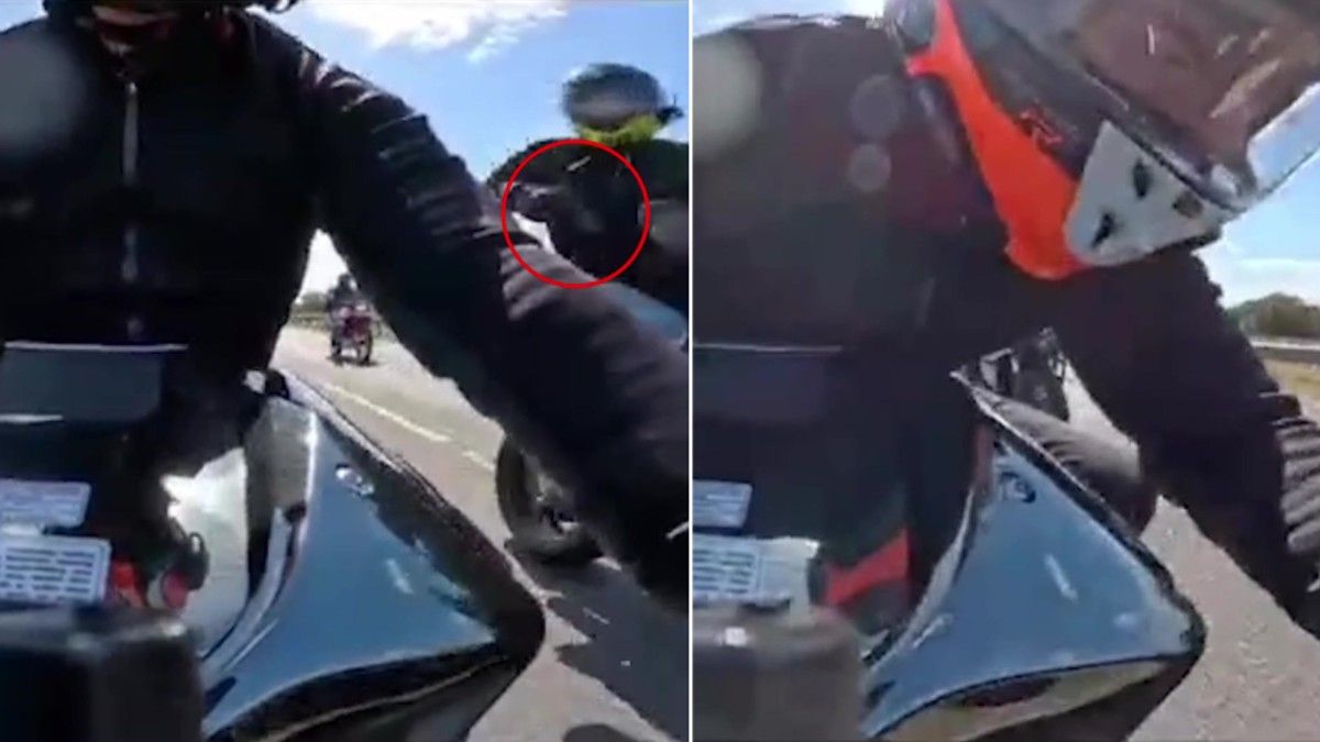 Las imágenes quedaron registradas por la cámara que llevaba el motociclista víctima del intento de robo en el tablero de su Kawasaki Ninja H2R. Allí se ve cómo uno de los rodados de los motochorros se le pone a la par y luego uno de ellos empieza a dispararle al dueño de la moto.