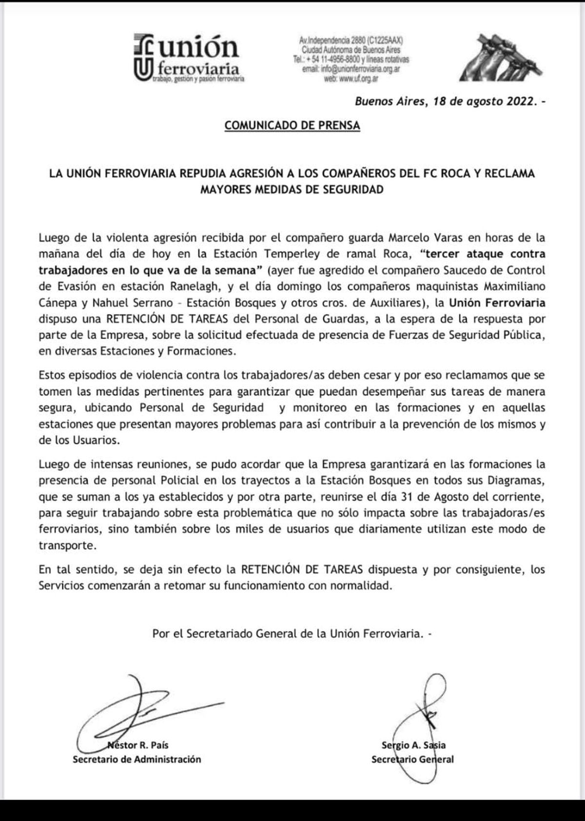 A través de un comunicado, la Unión Ferroviaria levantó el paro del servicio de trenes y la línea Roca comenzará a normalizarse en los próximos minutos. El funcionamiento del Tren Roca se interrumpió las 10.30 como consecuencia de la agresión contra un guarda en la estación de Temperley, ocurrida a las 8.50.