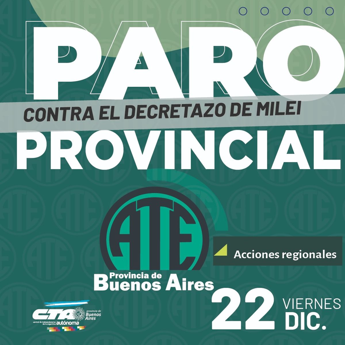 Para este viernes 22 de diciembre, El Consejo Directivo Provincial de la Asociación de Trabajadores Estatales (ATE) convocó a un paro en toda la provincia de Buenos Aires como forma de protesta contra el Decreto de Necesidad y Urgencia (DNU) promulgado por el presidente Javier Milei con el que se pretende desregular la economía nacional.