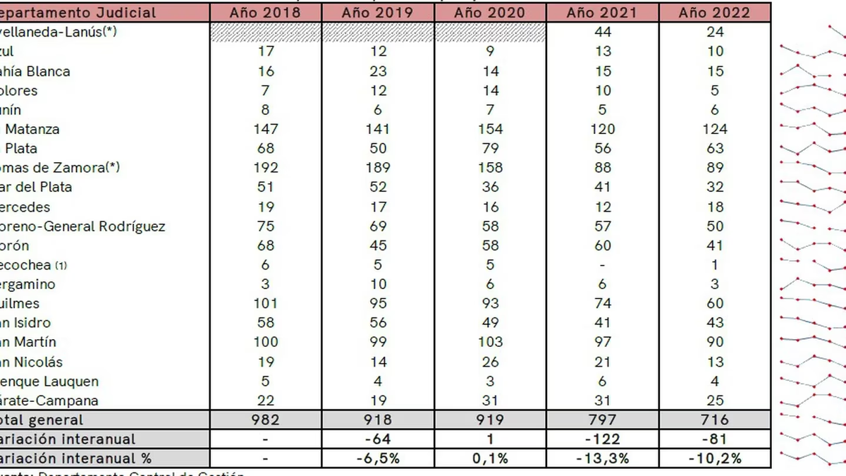 La Plata pasó de 56 a 63 hechos. Lomas de Zamora, de 88 a 89 hechos. Bahía Blanca se mantuvo en 15 hechos. San Isidro subió dos crímenes en sus cifras: de 41 casos a 43 en la variación interanual. Mercedes, de 12 a 18 casos.