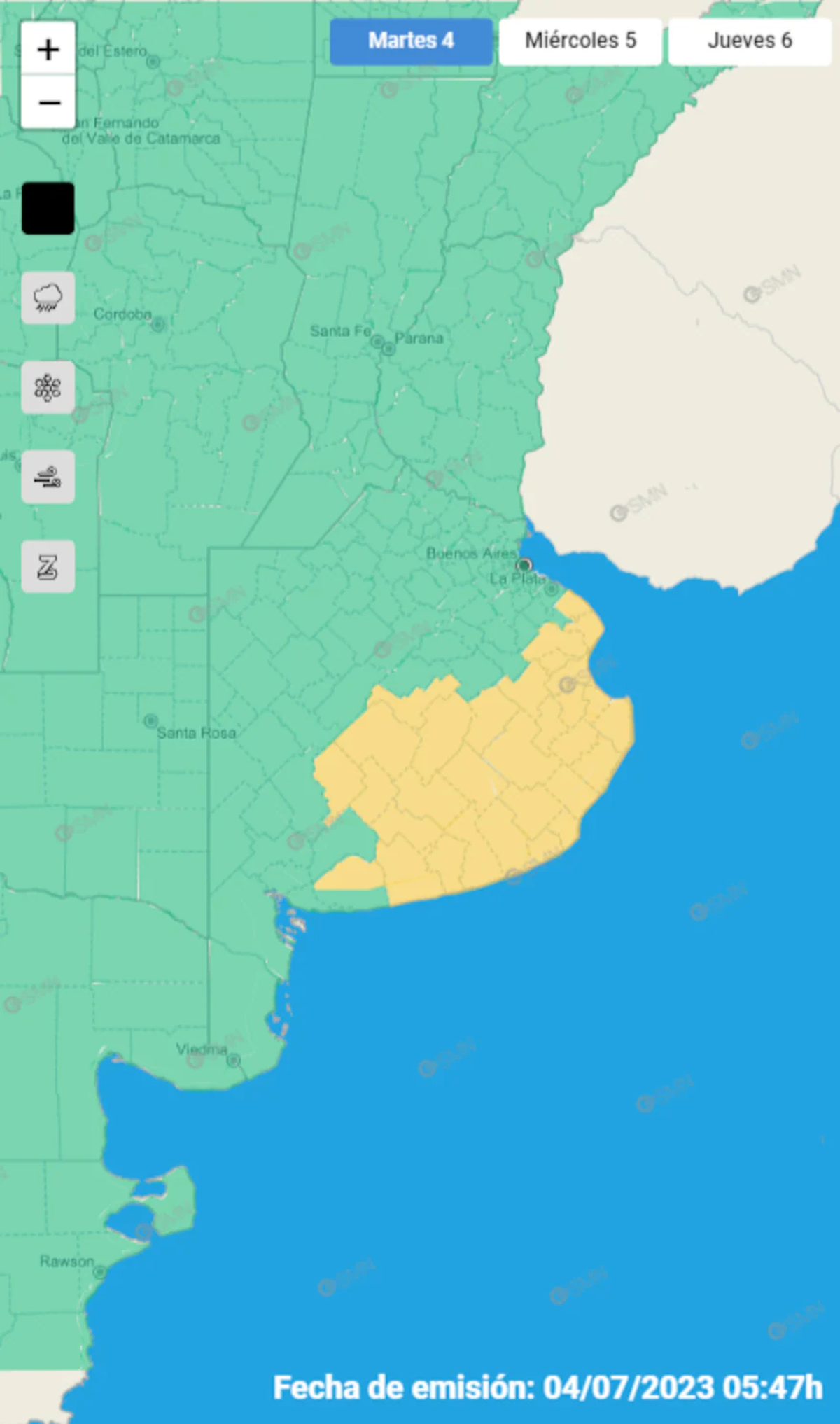 Se estima que por la tarde caigan precipitaciones en gran parte de la provincia de Buenos Aires y hay un sector donde rige la alerta amarilla. Esto es más bien para la zona Centro de la provincia y los partidos bonaerenses cercanos a la costa del mar argentino.